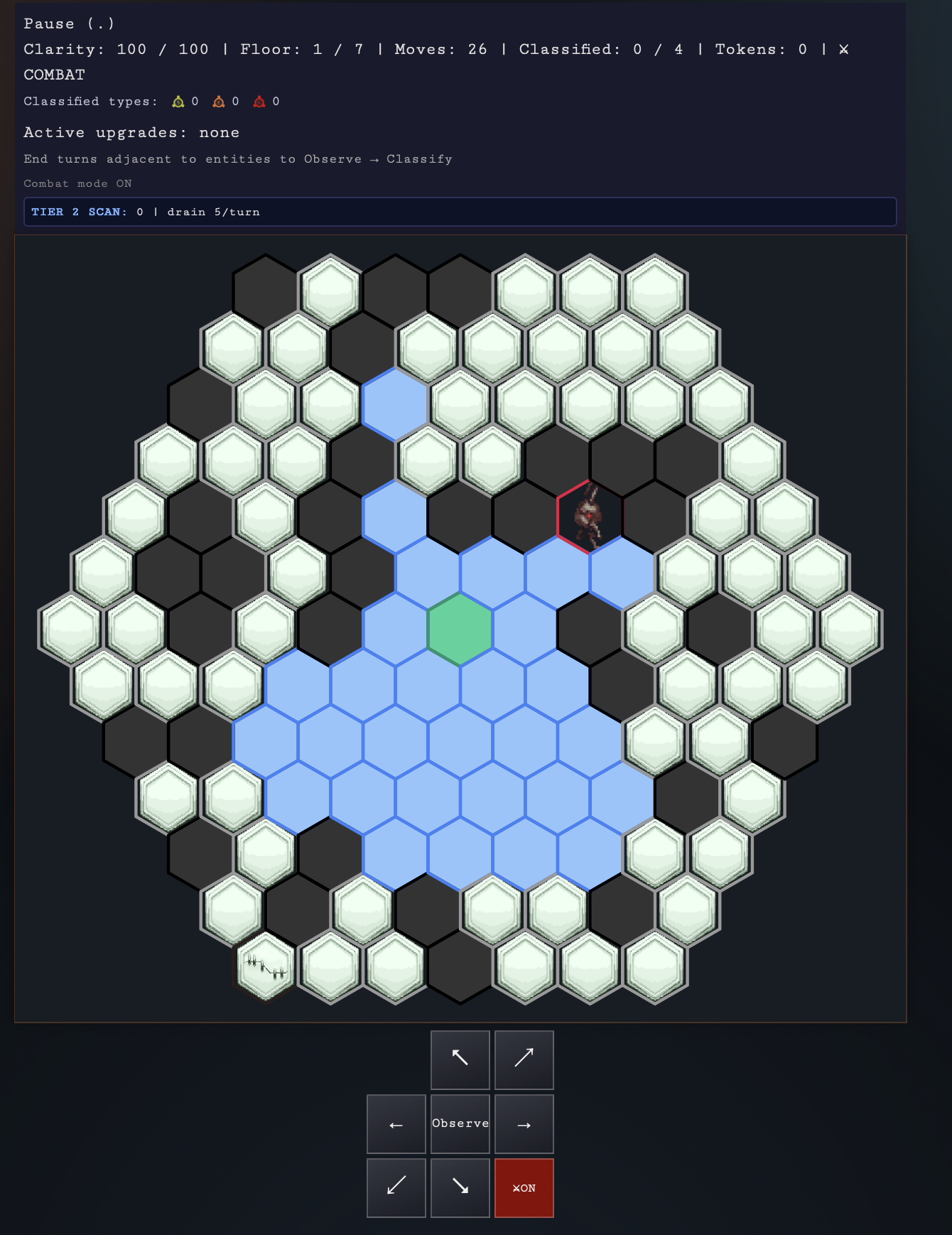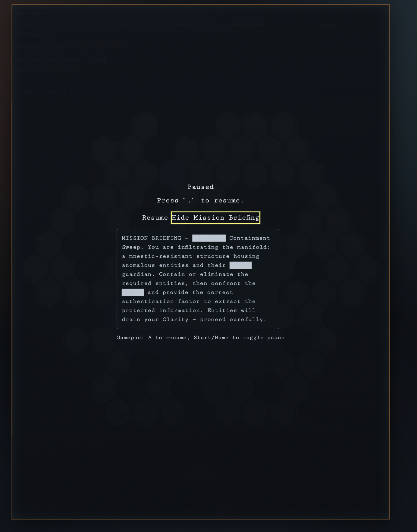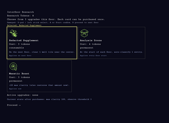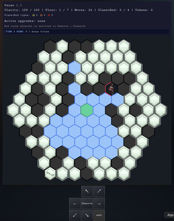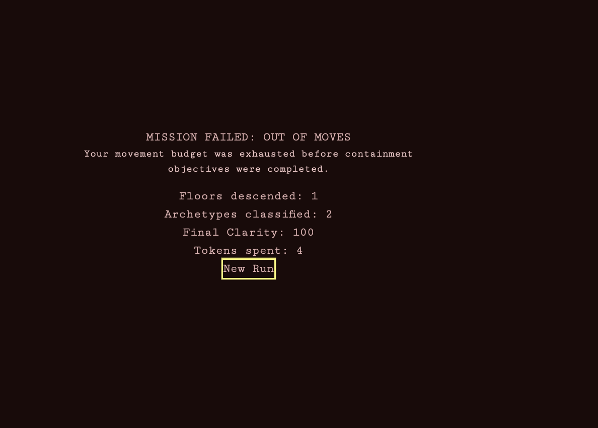 Observe and classify entities before their presence erodes your clarity — the only thing keeping you sane and alive. Descend floor by floor, manage your research tokens between floors, and reach the Null Sector, where ██████ has been waiting... to be remembered.